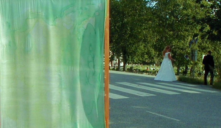 The green piece; silk painting (one of twelve pieces, each one measuring 140 x 200 cms); outdoor installation at Vårdinge Kyrkskola, September 2007