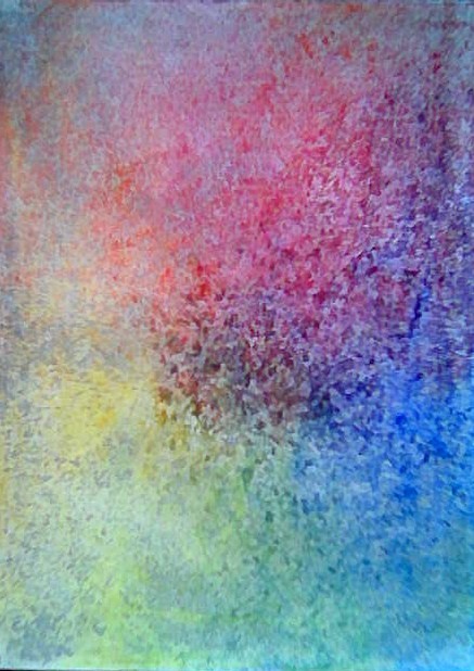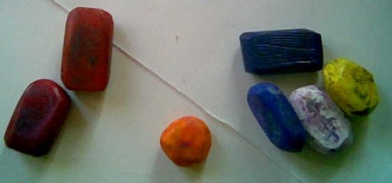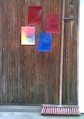 In between, from last week’s experience, some basic colour exercises; wax crayons, white paper. These wax crayons come in six primary colours; two yellow, two reds, two blue. In each pair, there is a difference in temperature and brightness, as well as in colour; of the two yellow ones, for instance, one tends towards green and the other towards orange; and so, secondary colours can be obtained in various shades of luminance. Their ‘bodyness’ belongs to the wax rather than to the pigments.