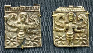 Thriai or bee-goddesses; golden placques from Rhodes, 7th century BCE; photo Jastrow/British Museum (Wikipedia)