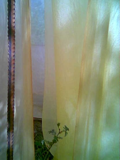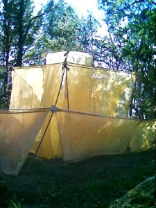 calling Apollo; construction with armoury irons, dyed silk fabric, rope and thread, 5 x 5 x 2,5 metres