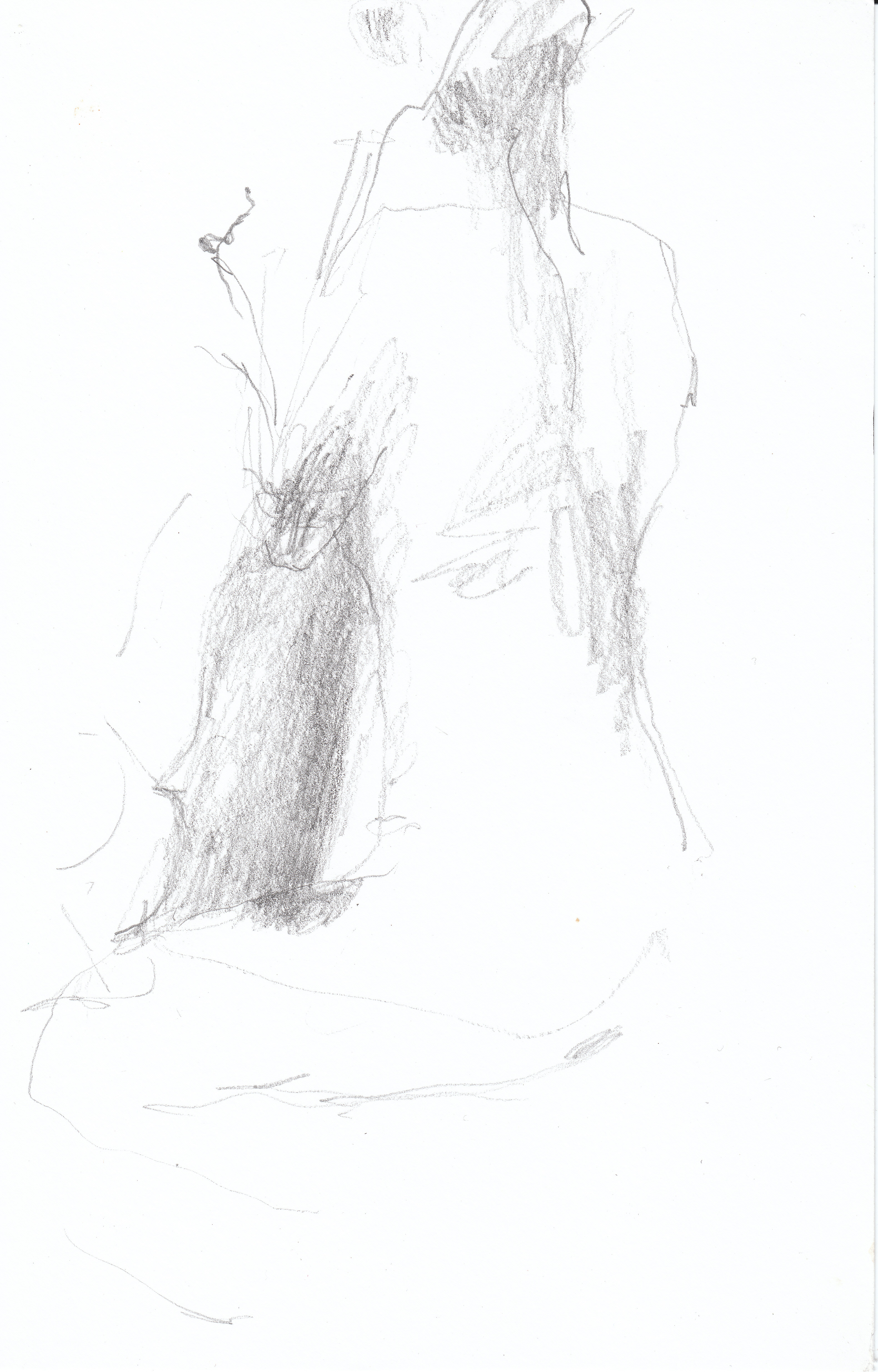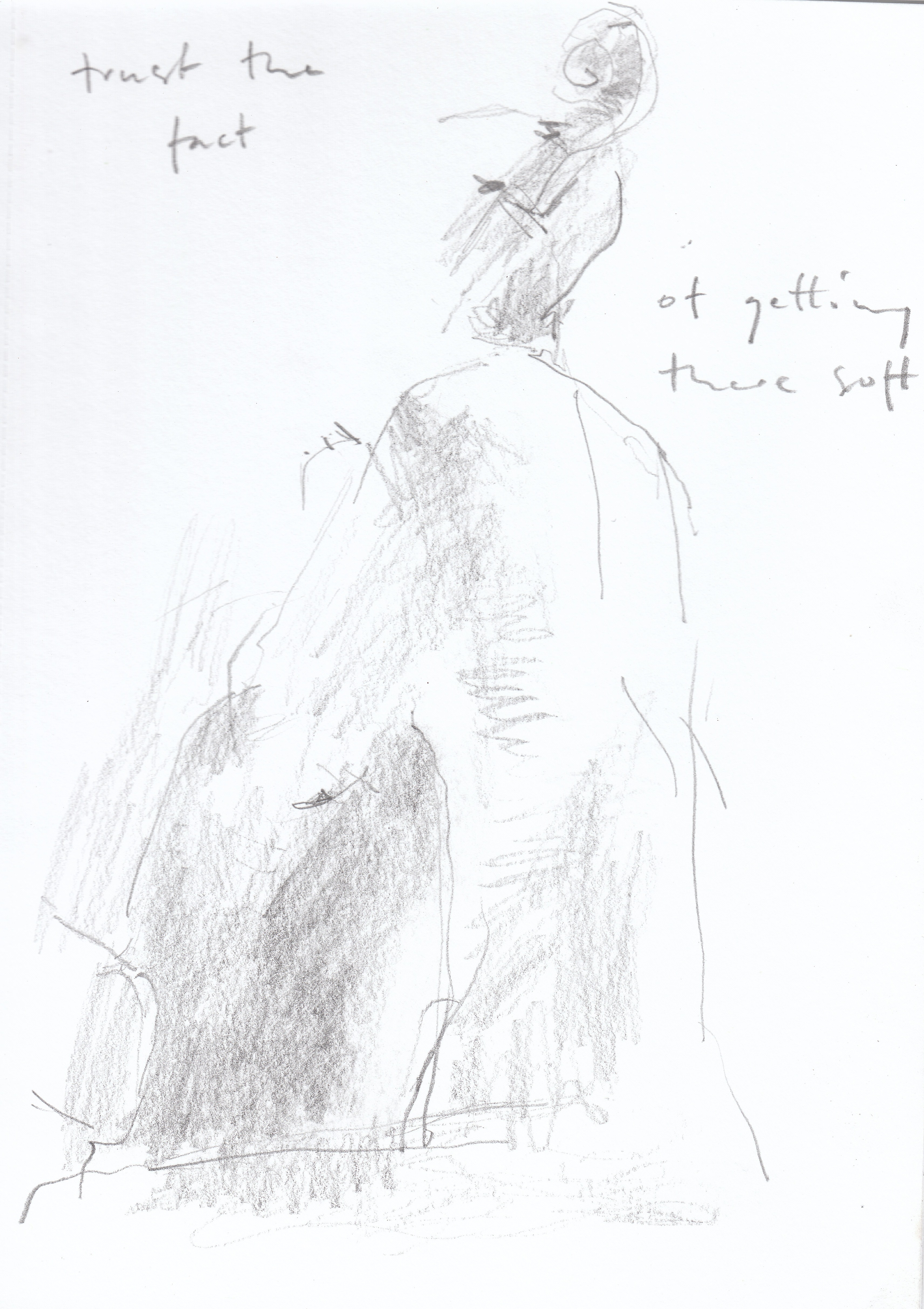 Yes, this is very different from drawing (for instance) dancers. While moving art performers interprete a temporal impulse into spatial, thus visible, reality, the orchestra’s performance establishes more of a polarity; the aim of the effort stays the audible field, and yet there is a great deal of ‘bodyness’: gleams of varnish on the violins; the instrumentalist’s physical concentration and coordination of movements in playing; the almost architectural issue of supporting and supported parts when the cello player brings her instrument in a ready-to-start position. And the conductor’s oral instructions helping to bridge the gap… like “trust the fact of getting there softly”… I’ll keep that one.