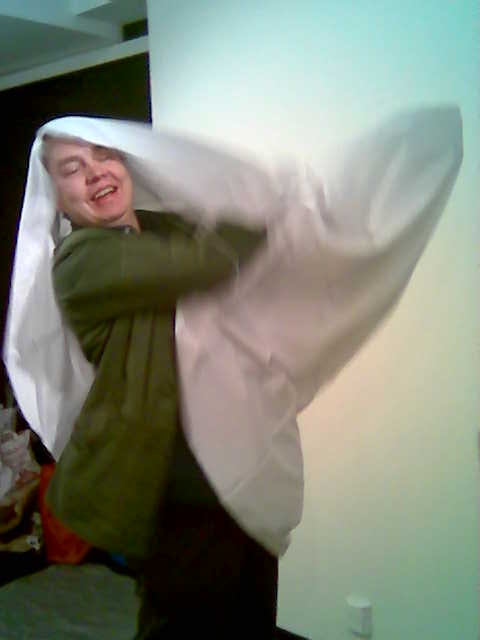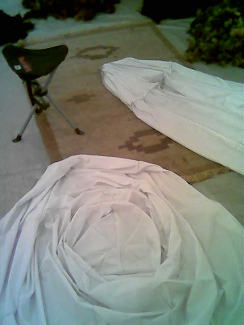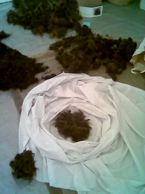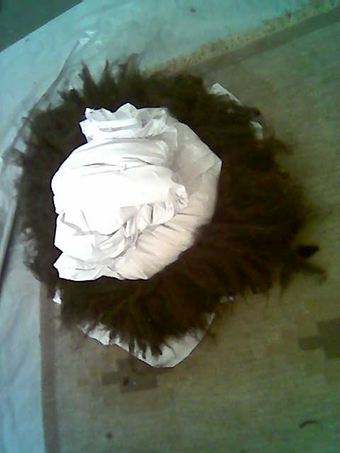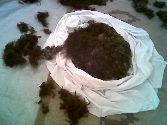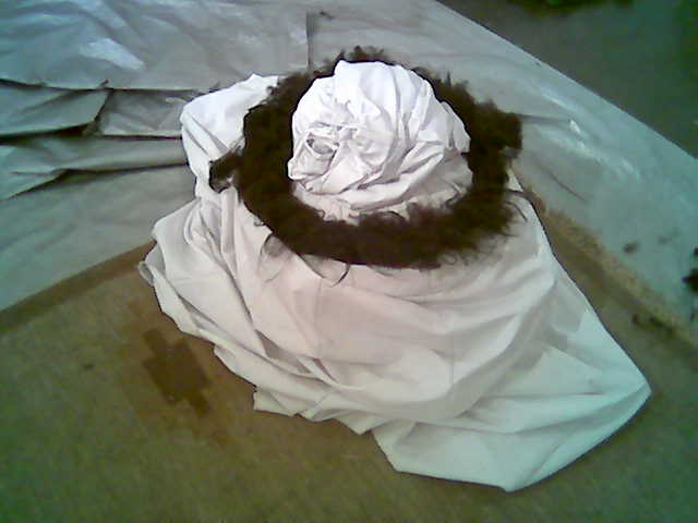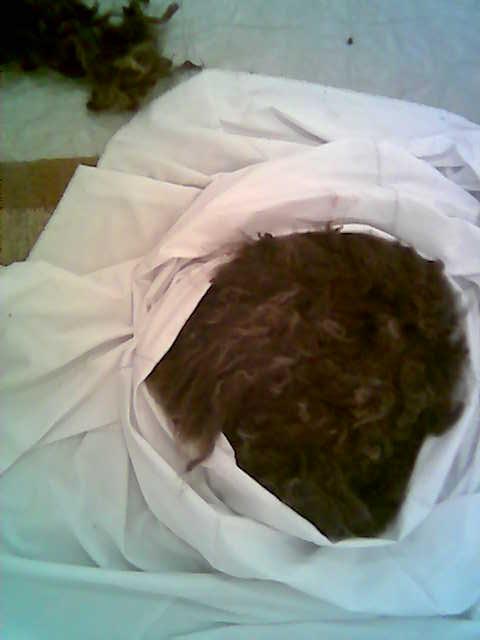 Reino keeps company, while I build the shape by filling wool from the bottom (which will eventually turn out top), spiralling out outwards and upwards and making sure that fibres are criss-crossing so as to keep together well when felted. Finally, I insert the inner bag filled with saw-dust (kindly provided by Timo) which is meant to keep the material fixed in shape while felting. But for the time being, I leave it there.