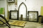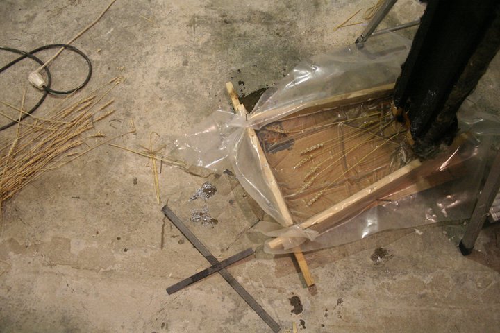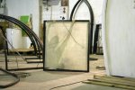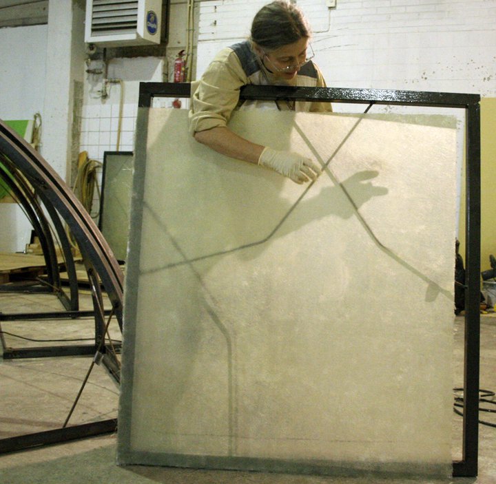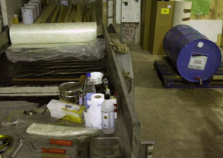So, yesterday we turned the thermostat up to 18°C and finally started the GRP (glassfibre reinforced polyester) moulding. Carefully following the instructions of our tutor Matti Suominen, I laid out the sheets on flat plywood surfaces – three times waxed – then left them to cure for 24 hours. Today, the GRP sheets could be removed to fit into the iron frames.