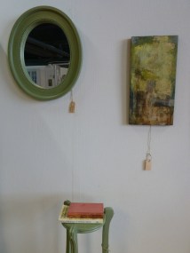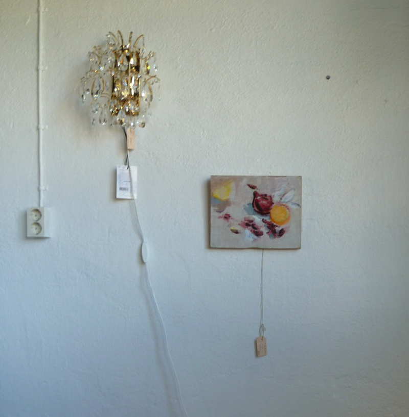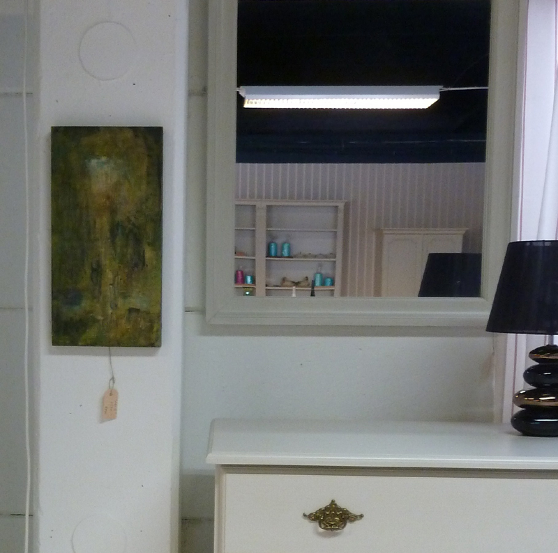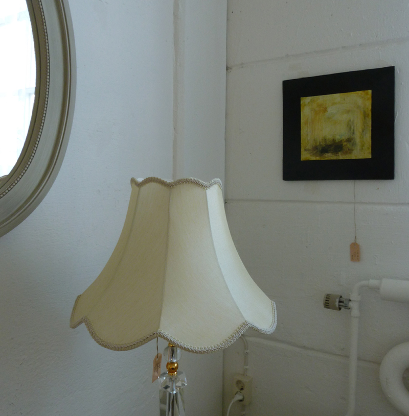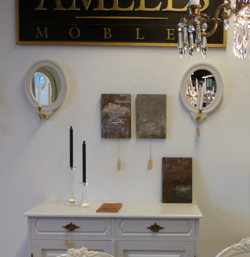These are some of my recent (and not-so-recent) paintings on display at Åmells Möbler, Gnesta. The scenography is basically the showroom of Åmells’ factory workshop – where 18th century furniture (rococo and Gustavian style) are manufactured largely by hand, and with great care and skills. Consequently, my installation emphasizes art as craftmanship and as merchandise; paintings are mounted to match furniture and displayed with prize labels.
