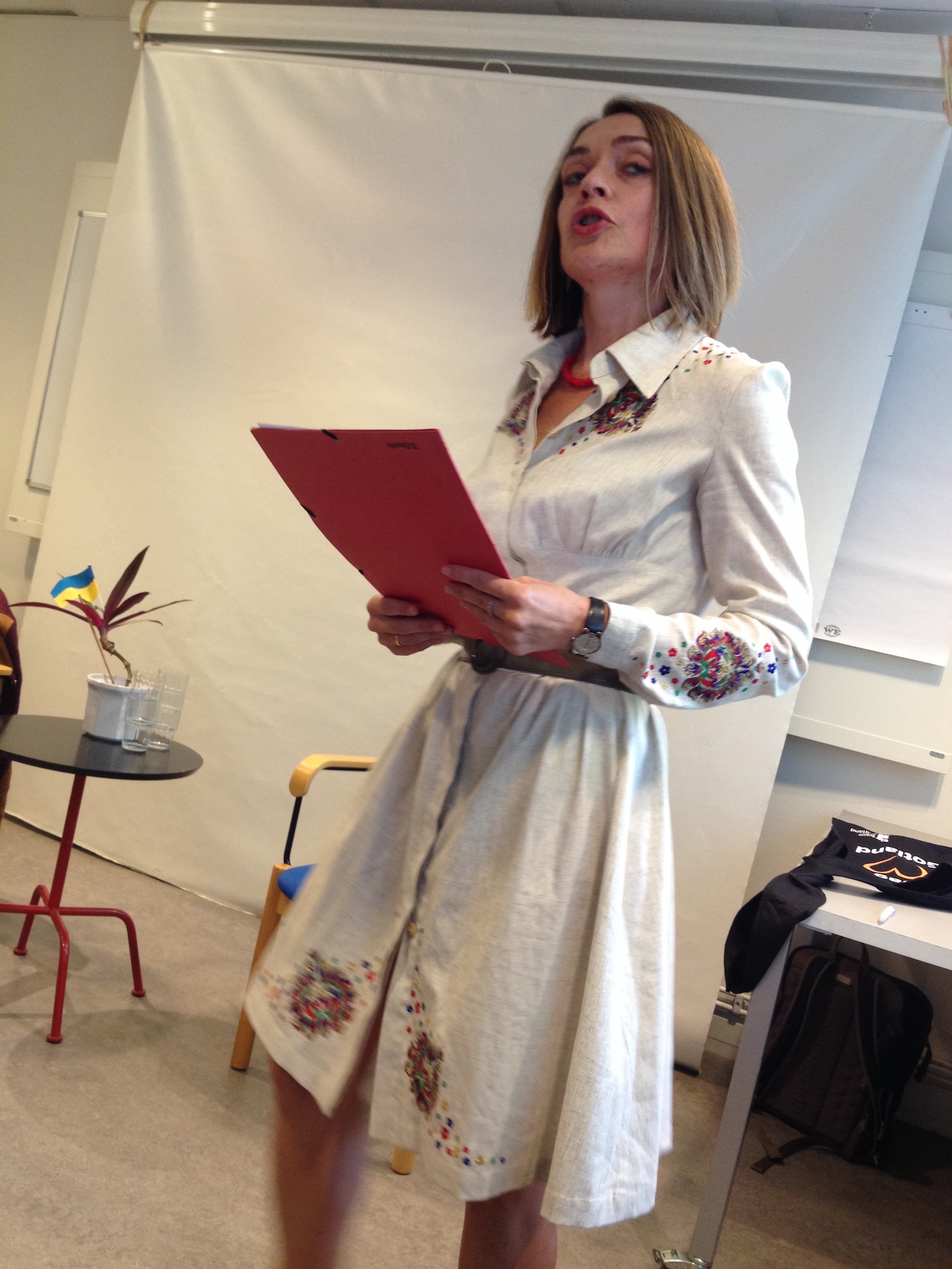 Now, this text is written in English – naturally, since it’s the only language we have in common. But in the last part of the project, we rendered it into our own languages; so, at the public reading, it was presented in four successive transformations. That is…