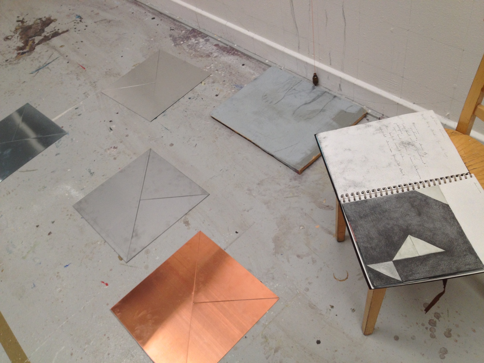 First day, I arrive in the afternoon to unload: sketchbook, metal plates, tools. I notice the wall needs some white paint, I’ll have to bring it tomorrow. Dusk falls.