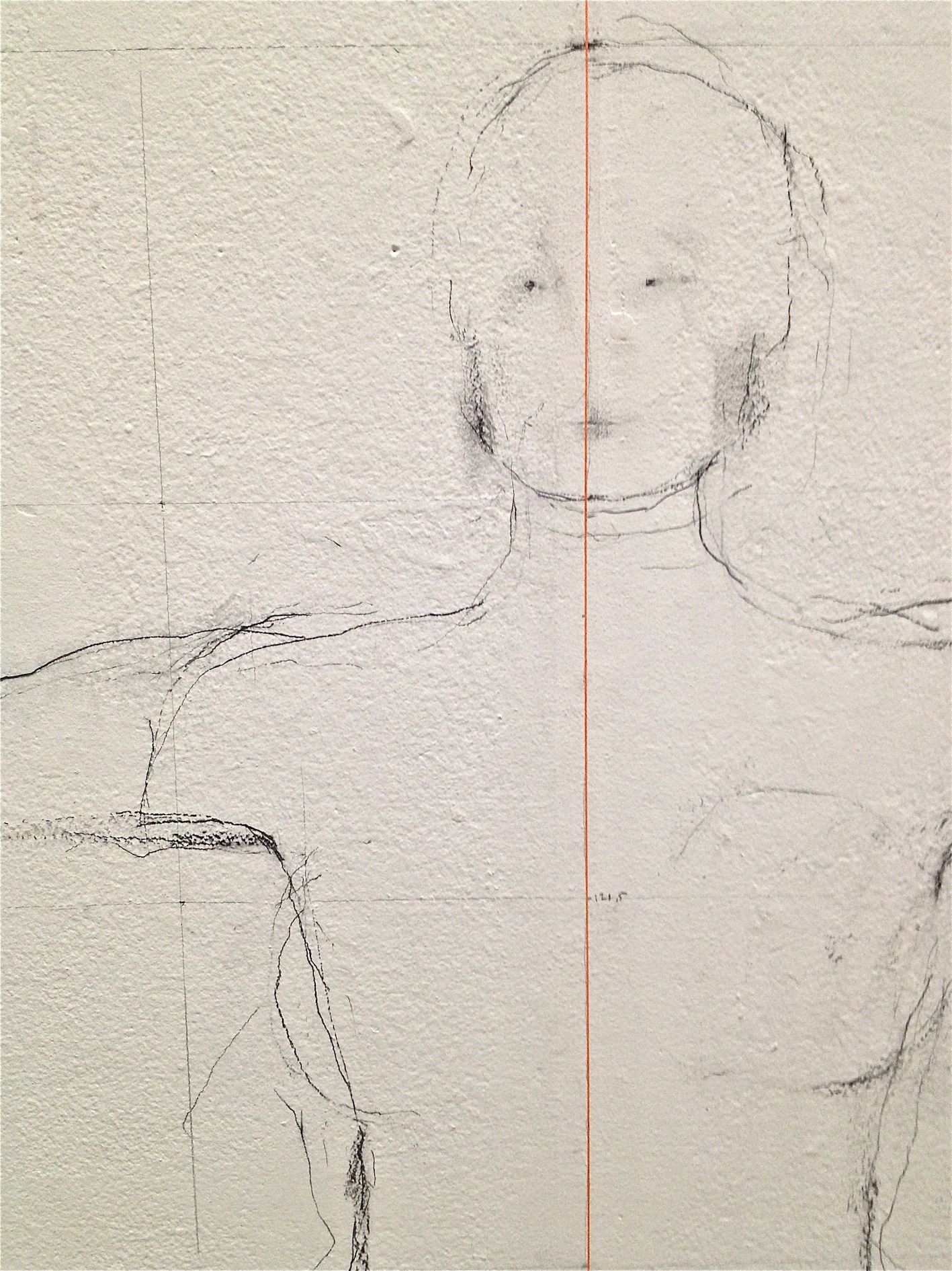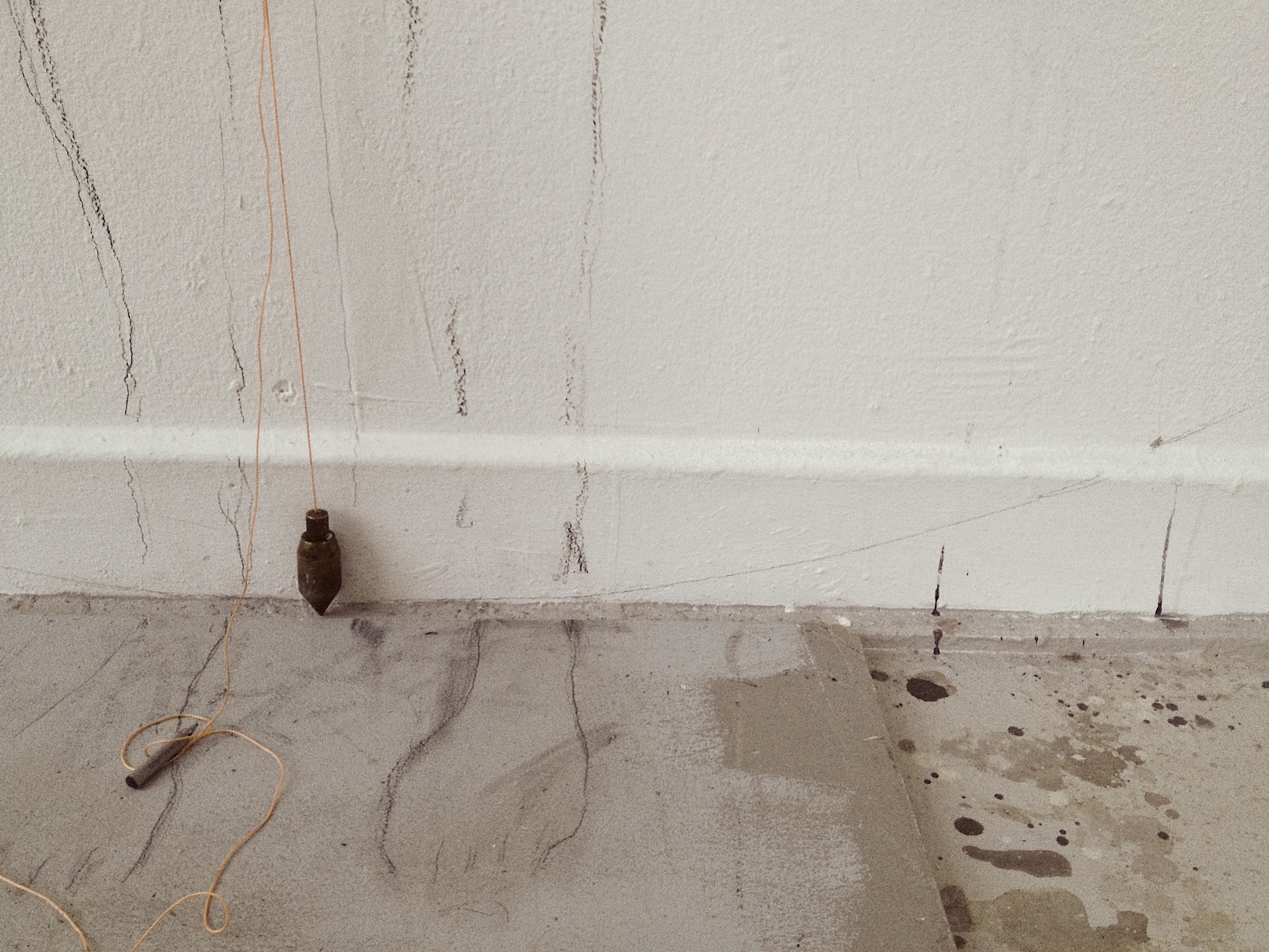 Sketching on white wall; plummet, graphite, charcoal, metal plates.