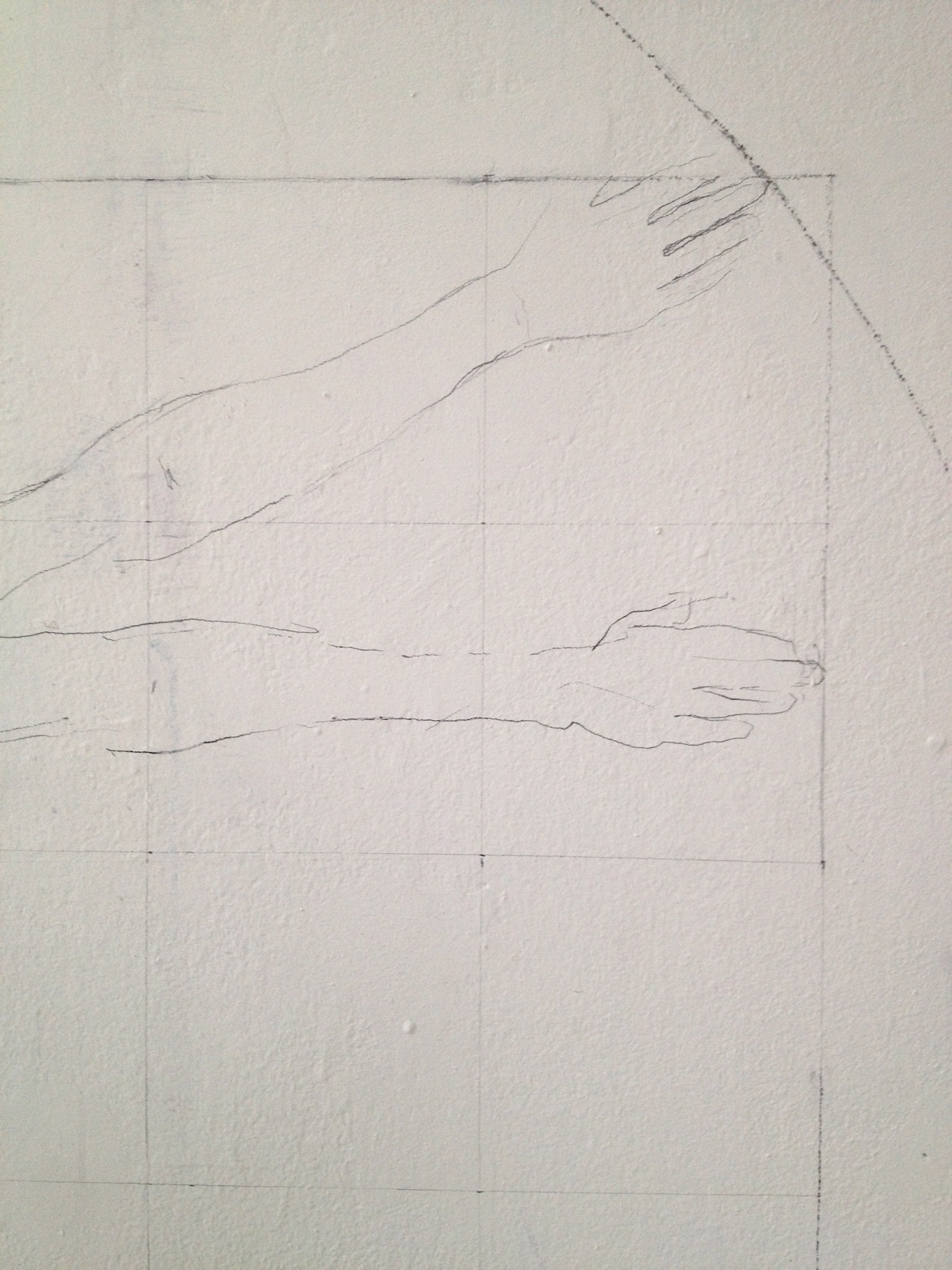 Next day: make space, whitewash the wall, hang the plummet, draw the outlines. Draw the circle, the grid.
