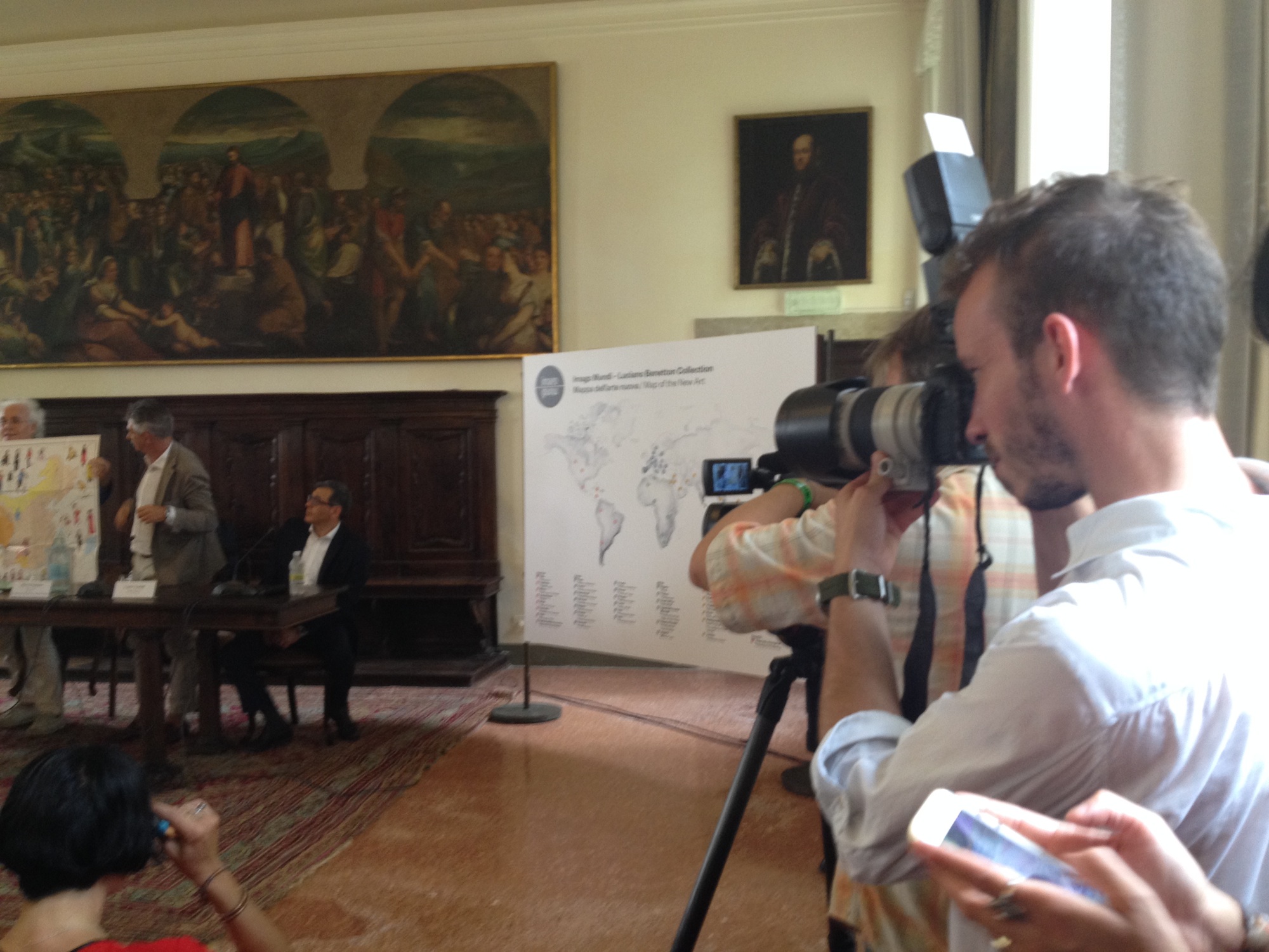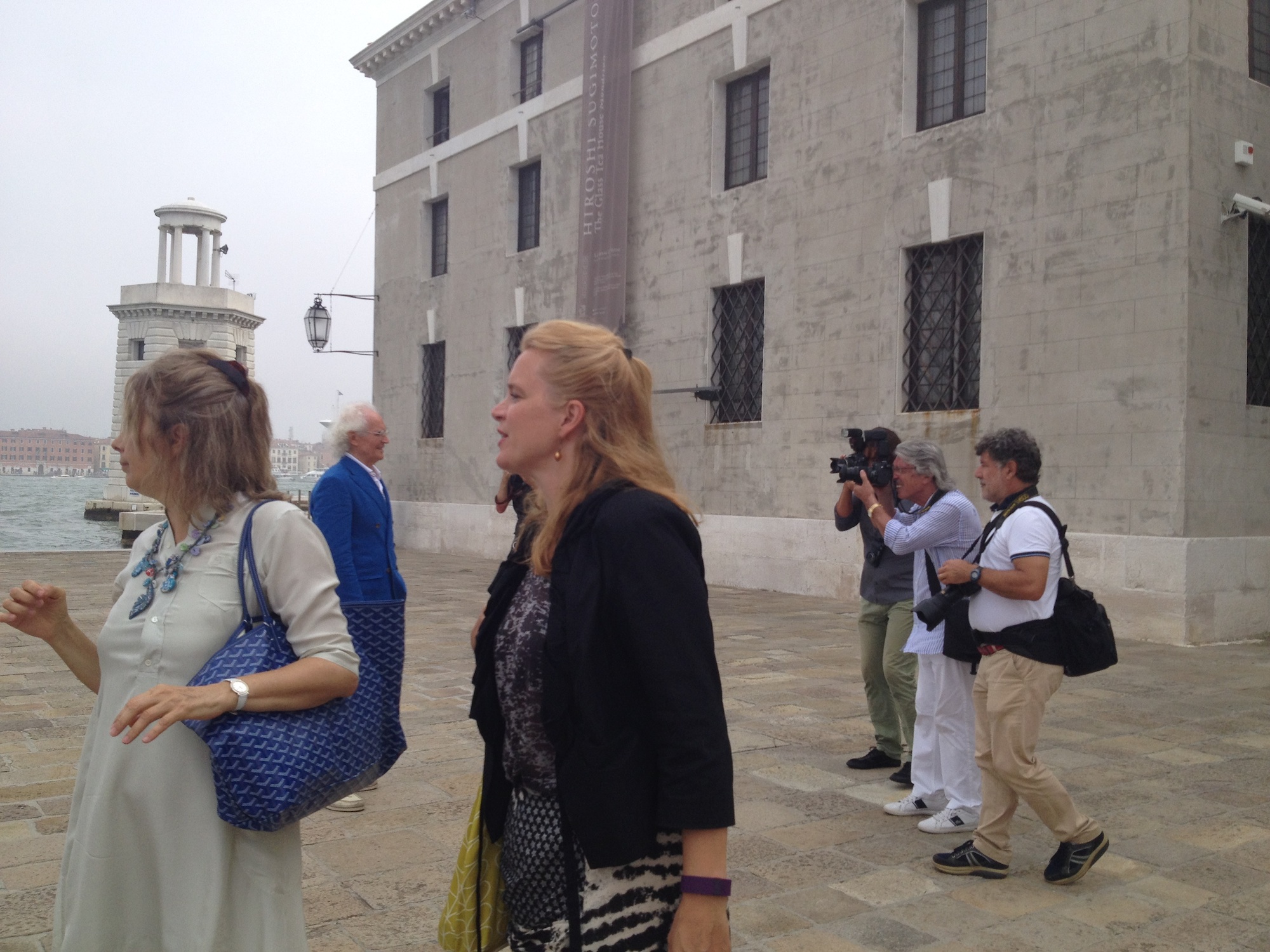there’s the Swedish curator Paula von Seth. We – the artists – gather around her trying to get a clue, while the photographers are clustering in front of the man in the blue jacket. Photo session finished, he invites us into the Fondazione Cini to present this project of his: