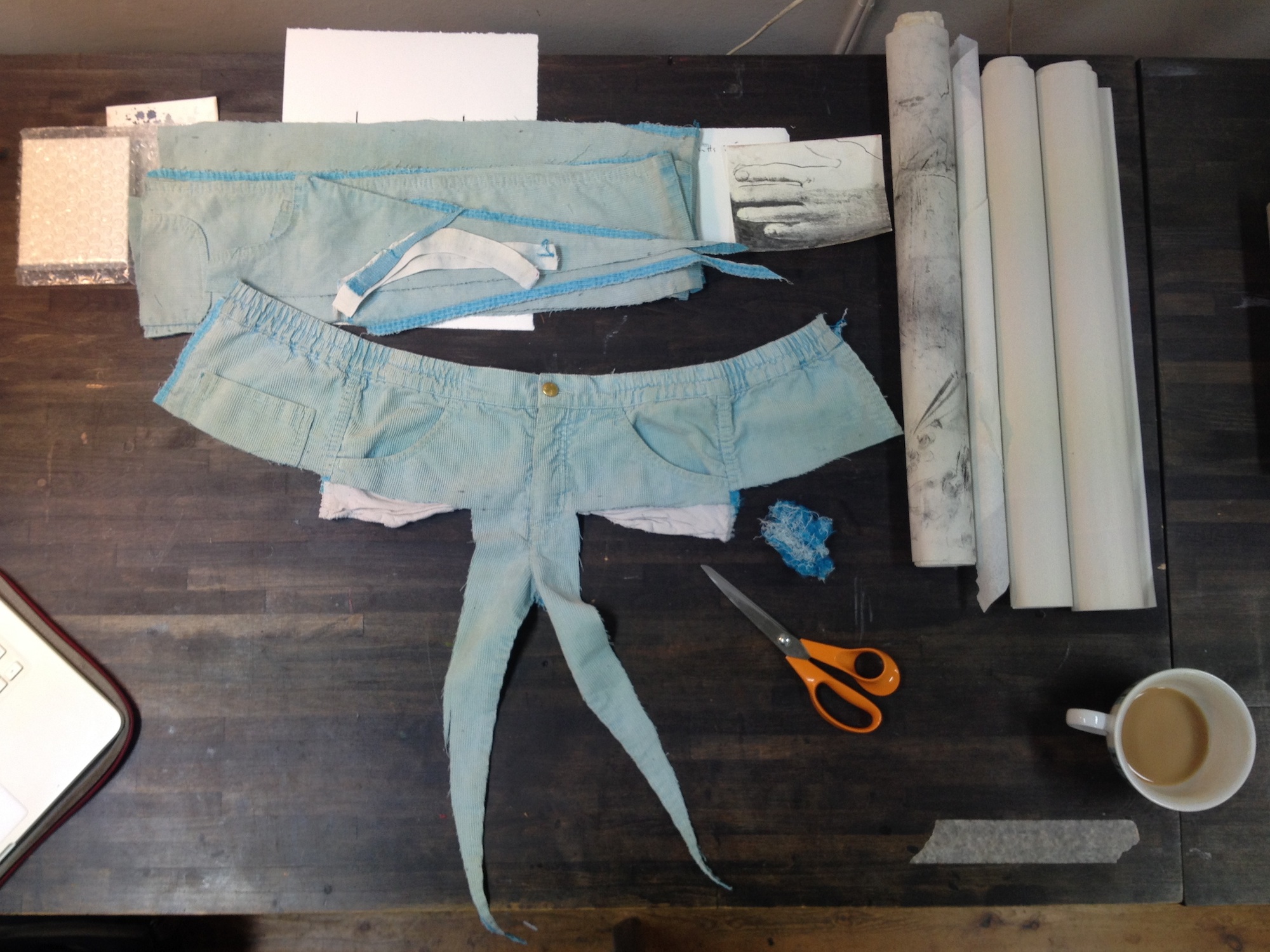 The idea of a book-scroll merges with the physicality of the textile. I begin to unstitch the bits and pieces of the garment. It takes quite some time; every stitch is firm and strong, not a single one has loosened (although  the fabric itself is almost see-through in certain patches). Somebody did a good work here… The original colour still remains inside the overlock seams. Removing one thread after another, I notice a label that says: MADE IN ITALY. Those were the days, now I guess they would have been manufactured in Bangladesh or Pakistan. I’m careful to save each piece of fabric, each thread. They keep the memory of somebody’s time. Somebody’s life.