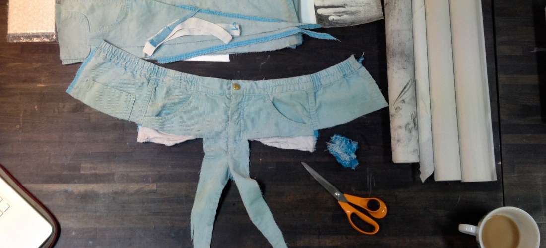 While trying to duck out of the frames, I remember the blue pants. The connection between the Benetton trademark and myself actually dates longer back than the Imago Mundi project – much longer. Back to 1985, to be exact; that was the year when I purchased those corduroy jeans for my firstborn, five-year-old son during a visit in Paris. We both delighted in the prince-like turquoise blue colour, and he kept wearing them for years to come. At last, when they were thoroughly worn-out and faded, I couldn’t dispose of them but carefully put them away in a drawer. Almost thirty years later, that’s where I find them. Carriers of memories and emotions – I bring them out to form a new picture.