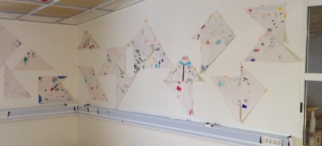 Inspired by Bernard Cahill’s “Butterfly Map” and Buckminster Fuller’s “Dymaxion Map”, I offered triangular pieces of drawing paper for the task. What I got in return was a stunning variety of expressions, mirroring individual temperaments and experiences – admirable visualisations and food for thought…