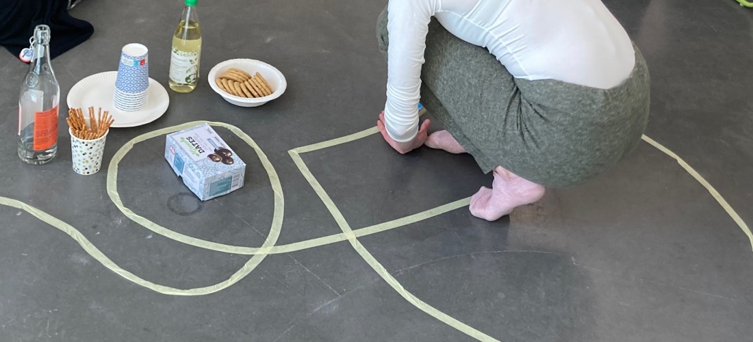 In the morning, I had a visiting group of students from the art class that I’ve shared the last weeks with, and their teachers. As I asked them to find an inherent theme when rearranging the material, they responded with an almost wordless collaboration – and a spontaneous installation from fabrics, tape and paper cups. Over the next hours, pairs of visitors kept dropping in… exchanging thoughts about space, body matters and grandkids; about Daniel Buren and giving up control; and the pleasing state of being banal.