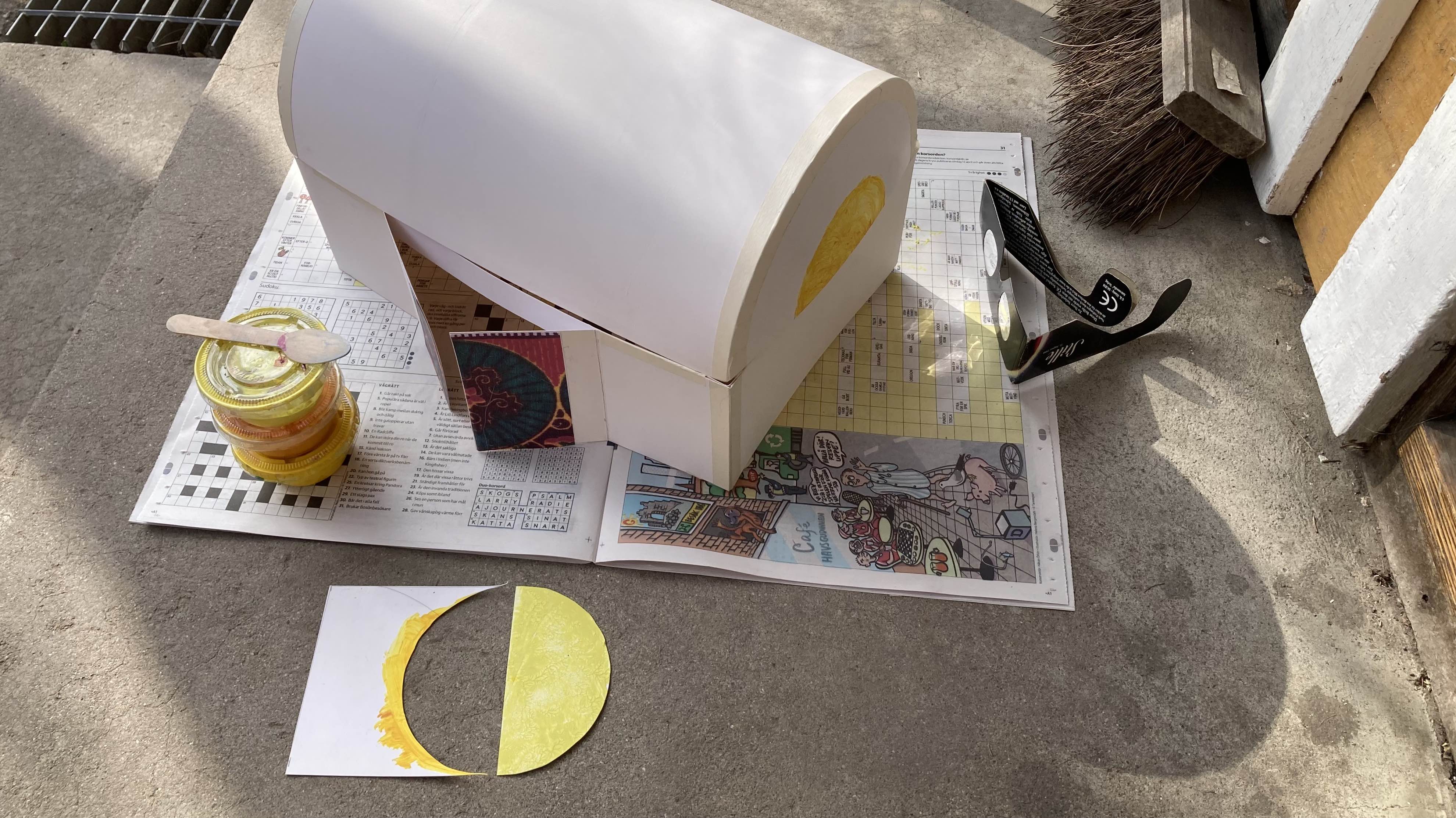 March 29th; sitting outdoors during a partial solar eclipse, manufacturing a cardboard maquette for a three-dimensional map. Half a yellow sun then found its way to one of the sidepieces.