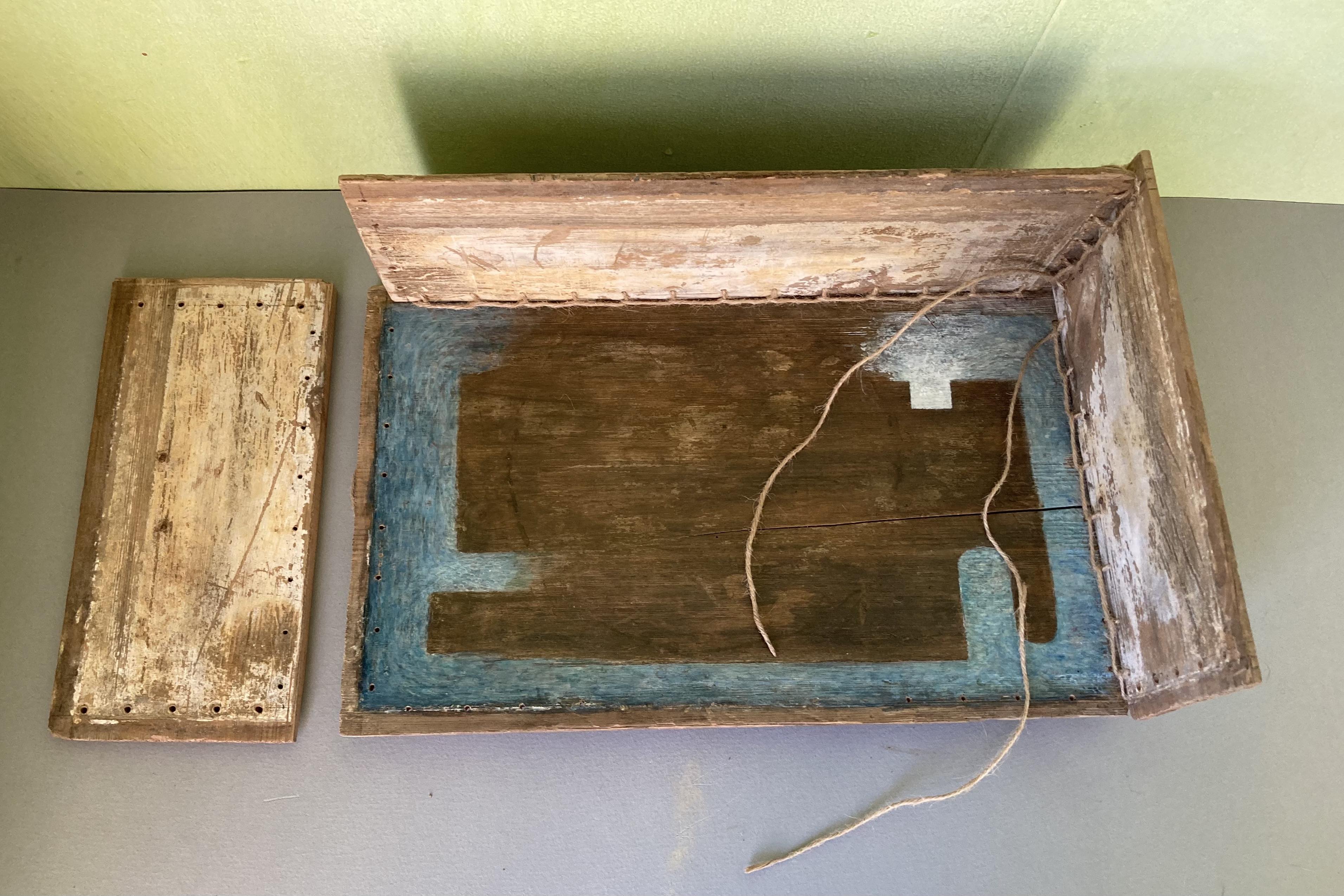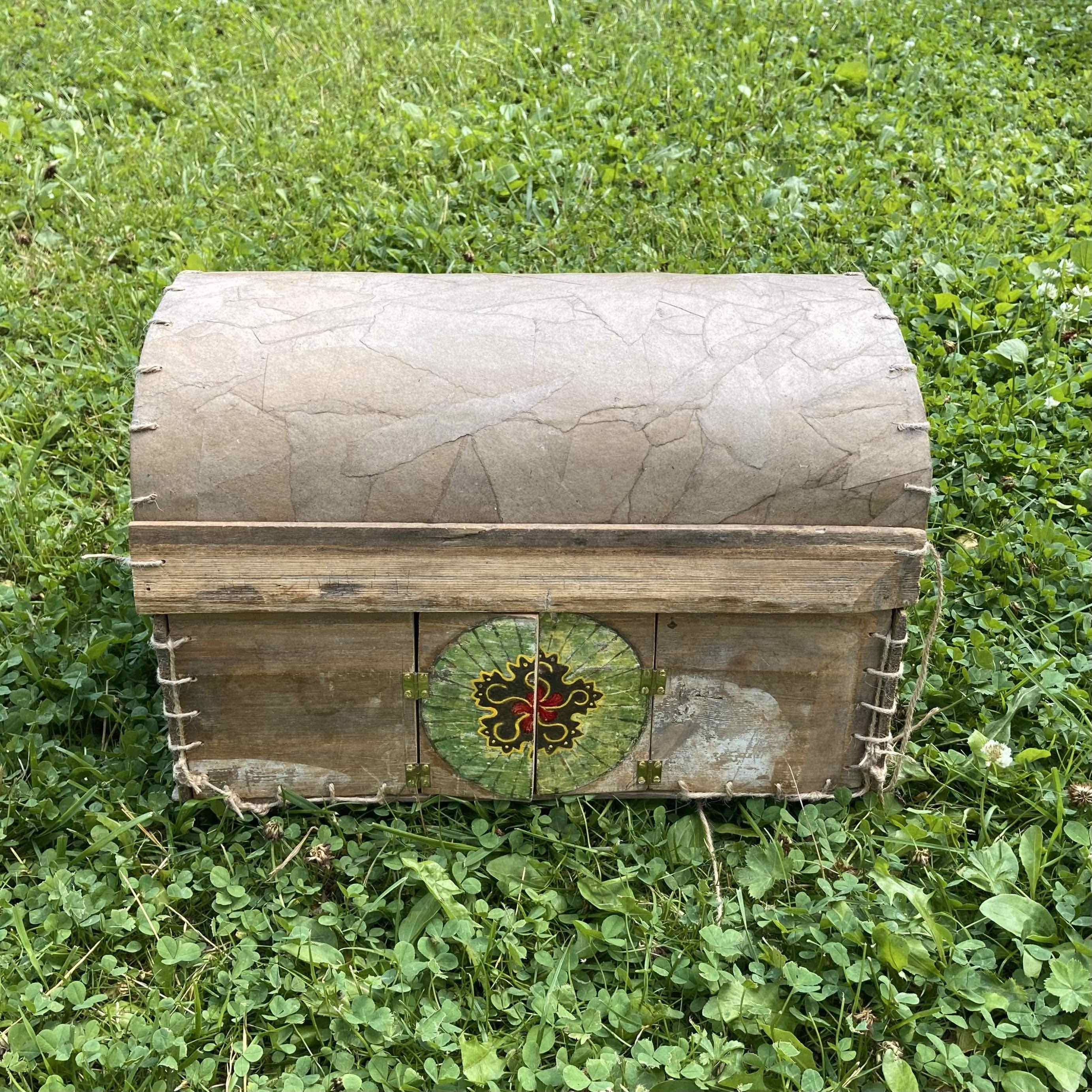 April: following the maquette study, the real construction began. Parts of an old door with flaking paint provided the material. A mountain with a house on top was fitted into the chest, and a vaulted papier maché lid added.