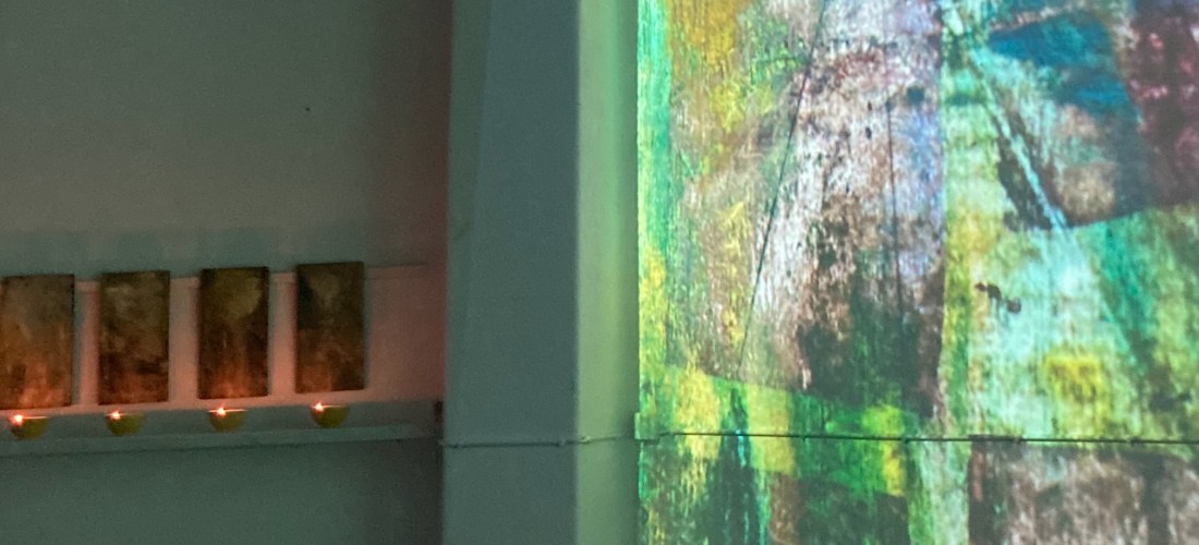 For Art’s Birthday 2022, the Watertower live event and web streaming were a multi-media transformation of my painting series the green octave. Through the skills of Johannes Ferm Winkler, eight little paintings were projected to fully cover three walls inside the tower – opening up to summer light in mid-January. Compositions by Erik Peters and Tomas Björkdal intermingling with voice improvisations, small talk and a Happy Birthday song; with Johanna Dahl playing a saw blade; with guests sounding on sound bowls, glasses and slowly melting ice floes.