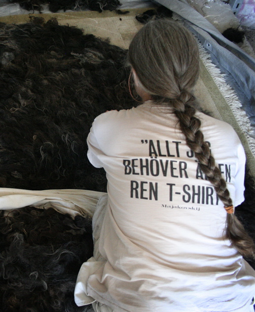The wool comes in colours which Kerstin describes as “black, graphite-grey, chocolate brown, chestnut brown and silvery”, and is extremely apt for felting. Furthermore, Kerstin cleans and combs her sheep before cutting the wool. The hides are packed separately, with the name of the individual sheep written on a slip of paper. So, we choose and mix between pitch-black, silver-tipped “Mats”, whose hair is coarse like the mane of a horse, greyish fluffy “Johanna” or silky coffee-and-milk brown “Karin”…