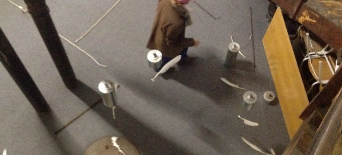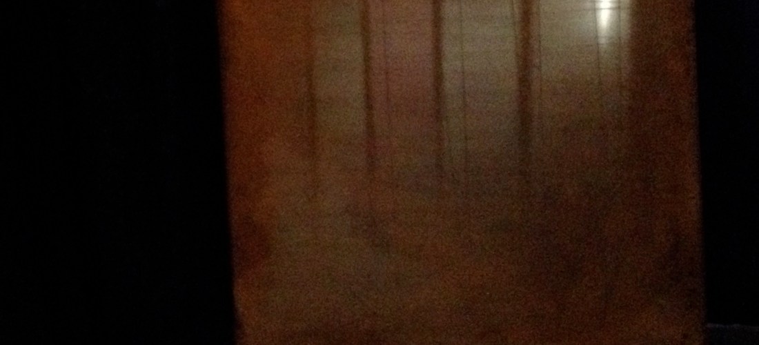 Clear sky again. In addition to yesterday’s colour dots projected into the theatre space, I want to try a two-direction setup; I cover some of the glass panes with lighting filters. When dusk falls, I will be able to use the theatre’s spotlights to project outwards, where untouched snow provides a large white screen. Glass items on the overhead projector produce stunning patterns. Dark, thinly woven fabric covers the long walls to improve acoustics; they also serve to doubling up and distorting the projections, amazing! Lena uses ropes to visualize a process of divergence and convergence… This is actually what we’re continuously practicing here; defining our starting points, then trying out ideas individually or in flexible constellations, then gathering for sharing and reflecting – and for long lunches! Then redefining, and starting over – converging, diverging, converging… Like breathing.