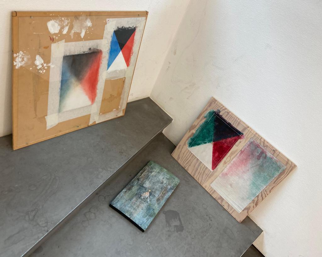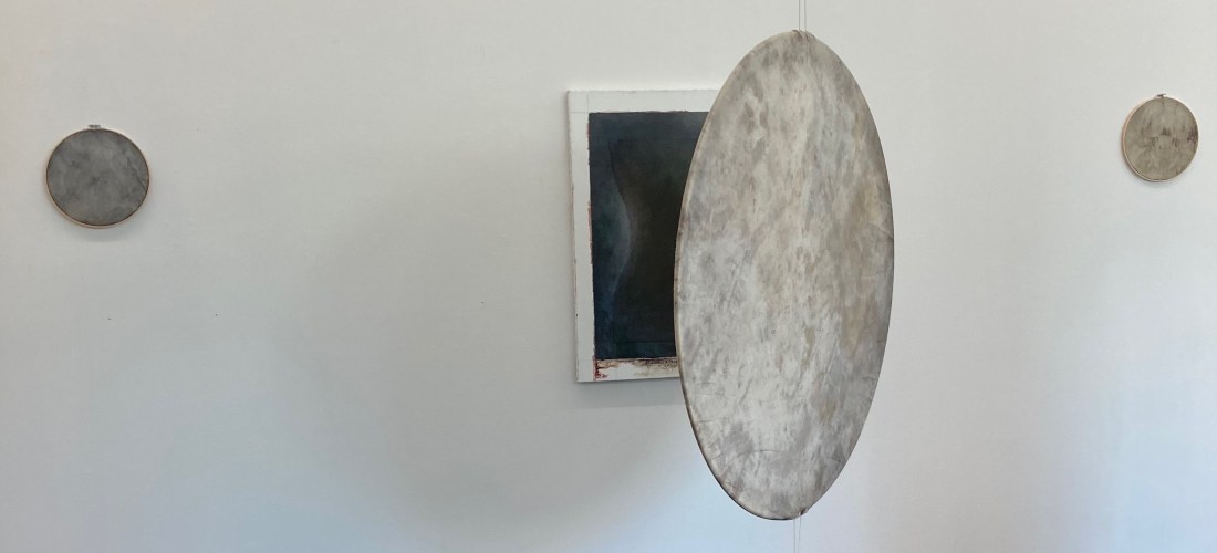Hanging completed in the Clara Schumann hall; on display from my part are three diary paintings (oil on wood panel) and four monthly pictures (blood, ashes and chinese ink on silk).