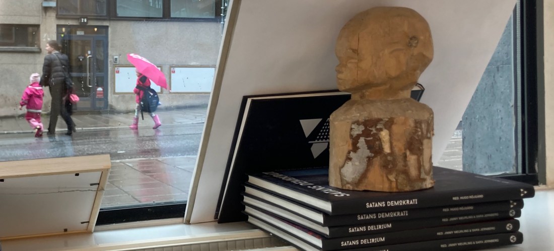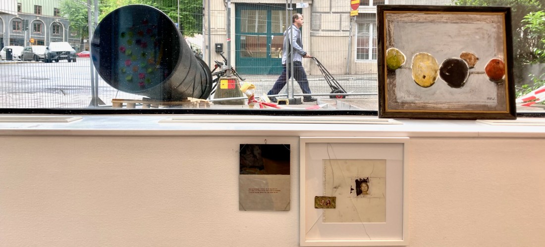 In the first floor foyer, painted wood sculptures by Tiago Altink are put on display. At the second floor, Jakob Sjöstedt’s sculptural sounding objects interplay with scenic elements of the locale. Missing on photo are Margrethe Sjöberg’s embroidered birds of fantasy, and Jouko Mario’s enigmatic paintings opening up to views of strange streets and buildings.
