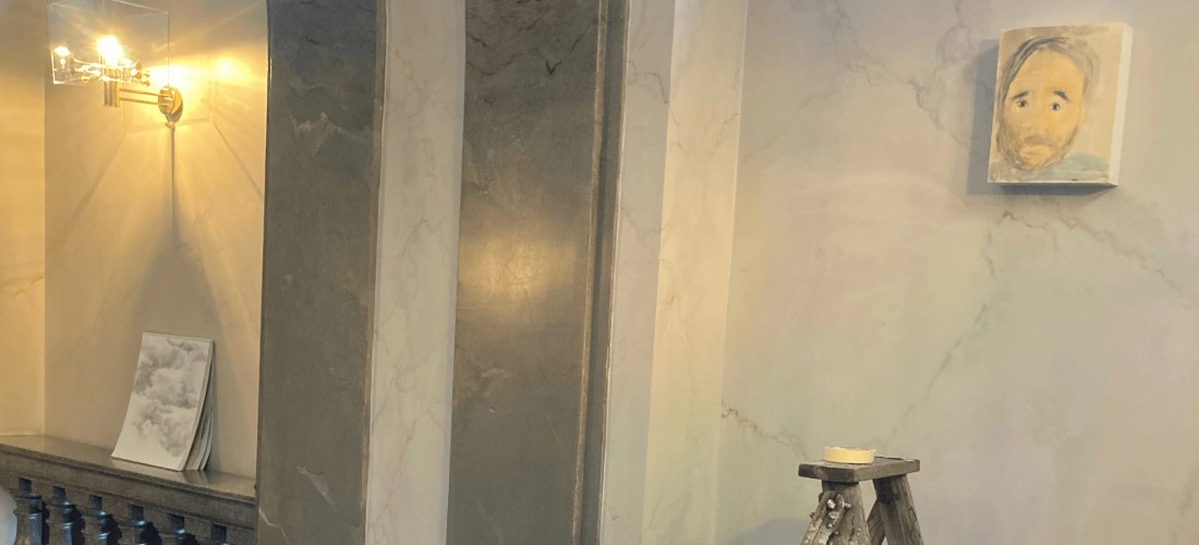 Halfway down another staircase, Stefan’s self portrait is a world in itself; I’m humbled and grateful to have my cloud drawing placed next to it.
