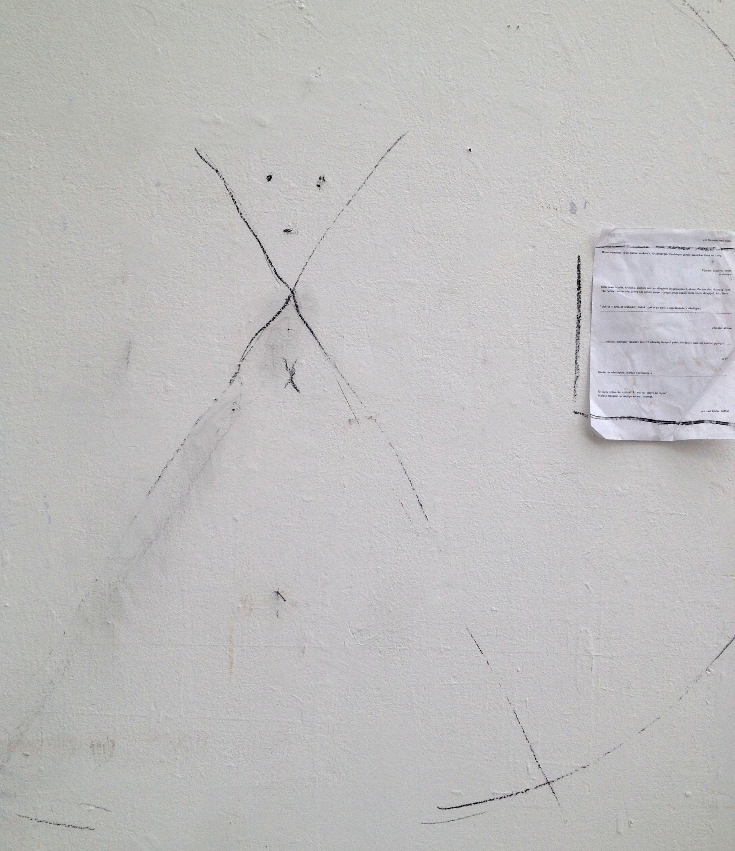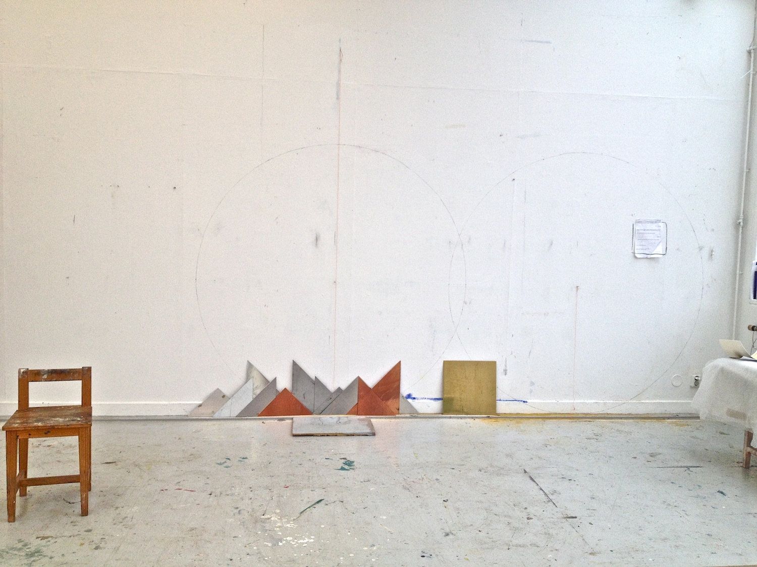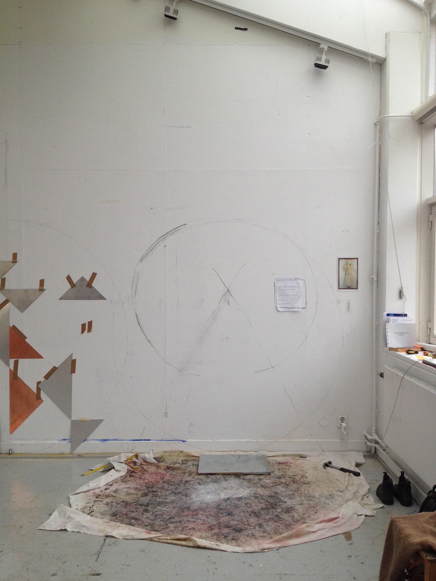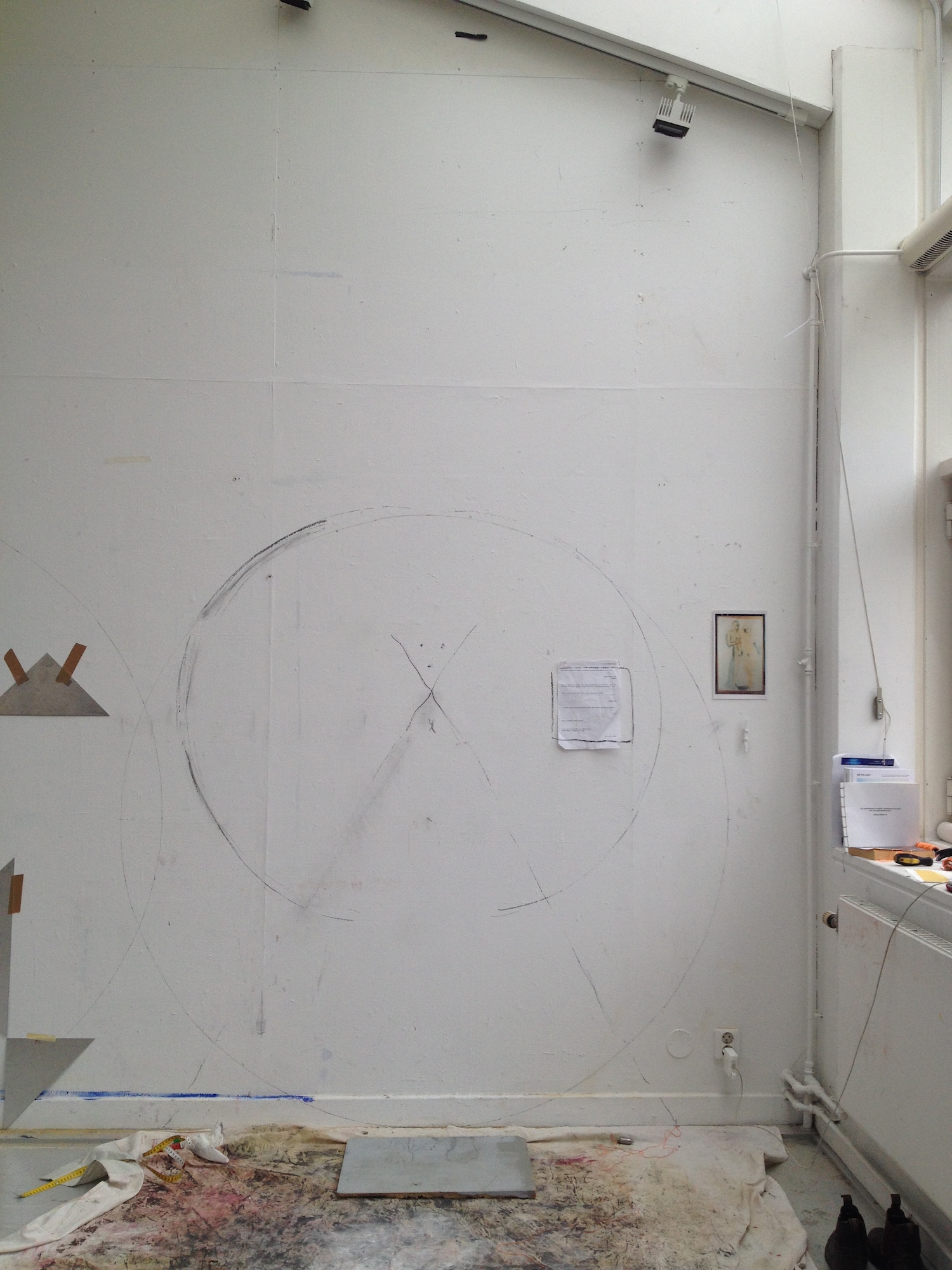 This time, I needn’t draw the grid because I know it anyway. I concentrate on the circle (or close-to-circle, to be exact). One laborative space isn’t enough, I need three; but, in duplicating the circle, I realize the wall isn’t really big enough. Fine, I’ll make the circles overlap then. One for the metals, one for the prints. And the third one for a text, as a beginning.