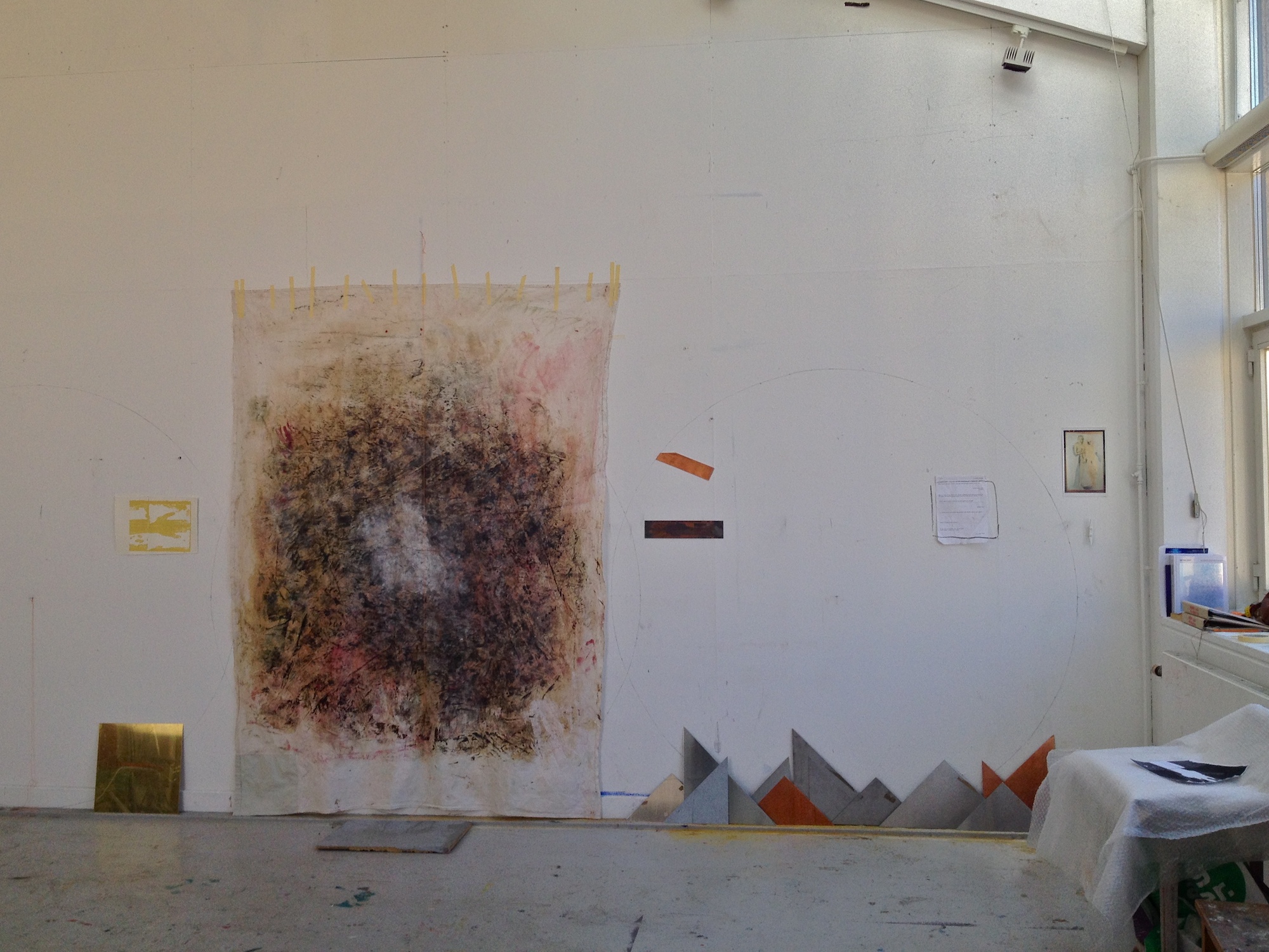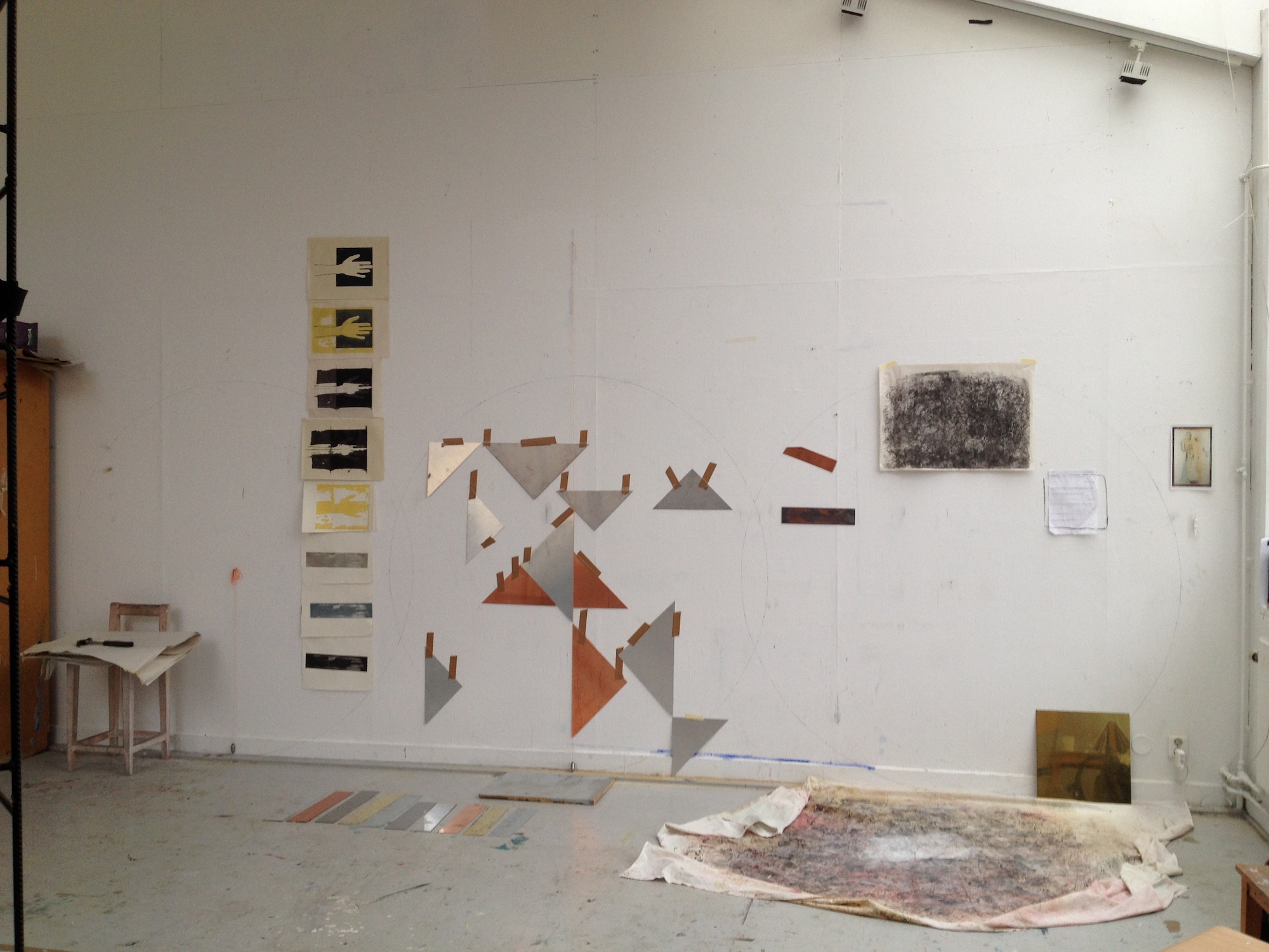 The Lighting Department at the Royal Institute of Technology is hosting an international Light Symposium in Stockholm. In the morning, I attend together with a group of students and teachers from the Royal Institute of Art… and in the afternoon, I hurry back to school for another two weeks in the painting studio. Bringing back the metal plates, adding the litho and intaglio prints I’ve made in the meantime, nailing the plummet to the wall once more.