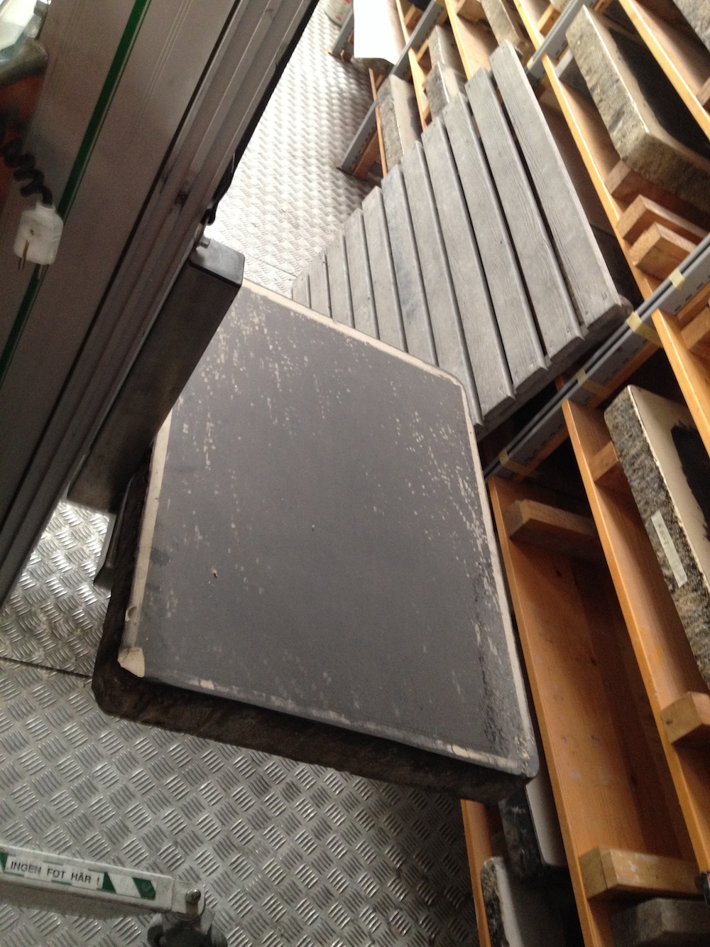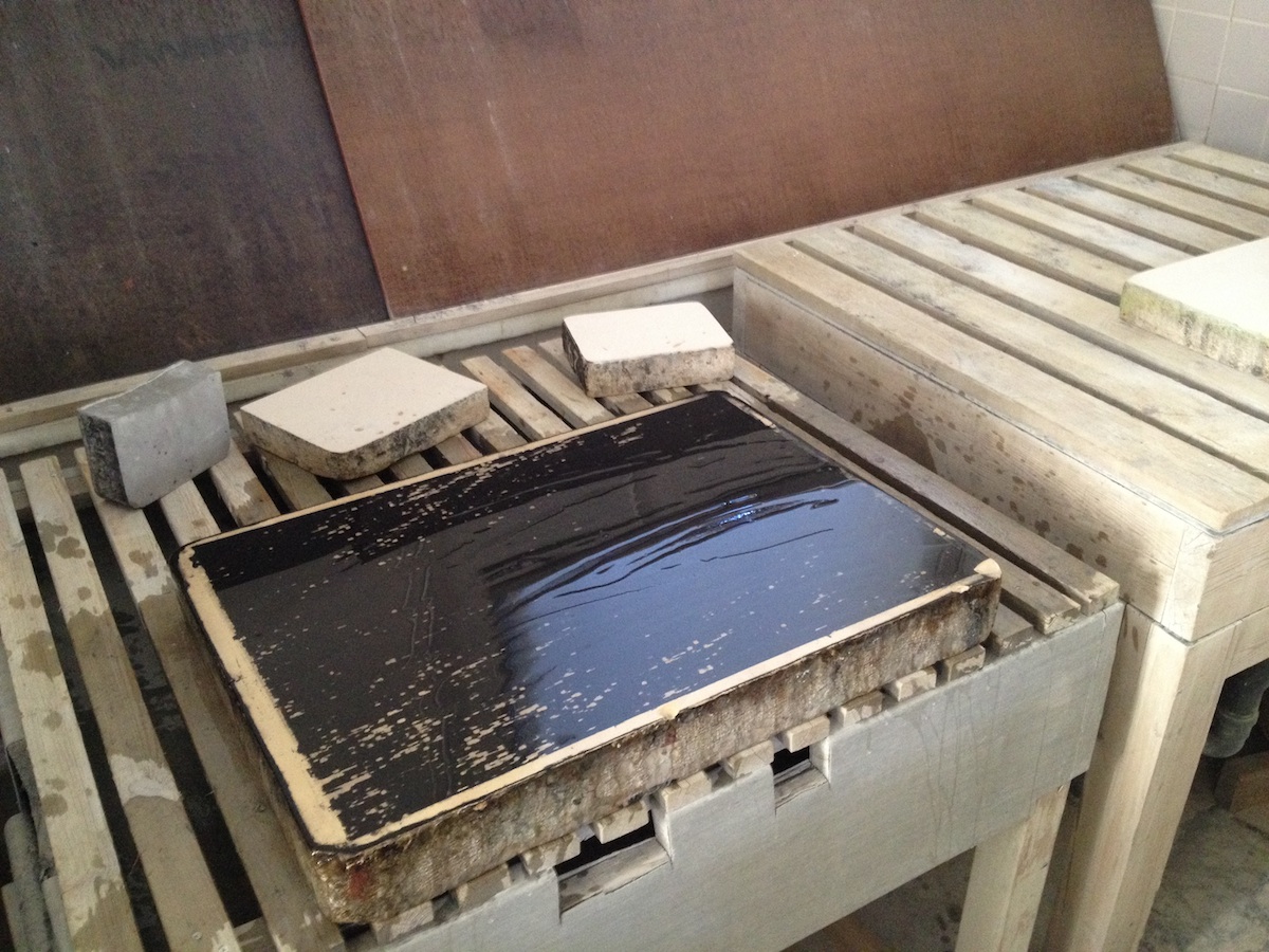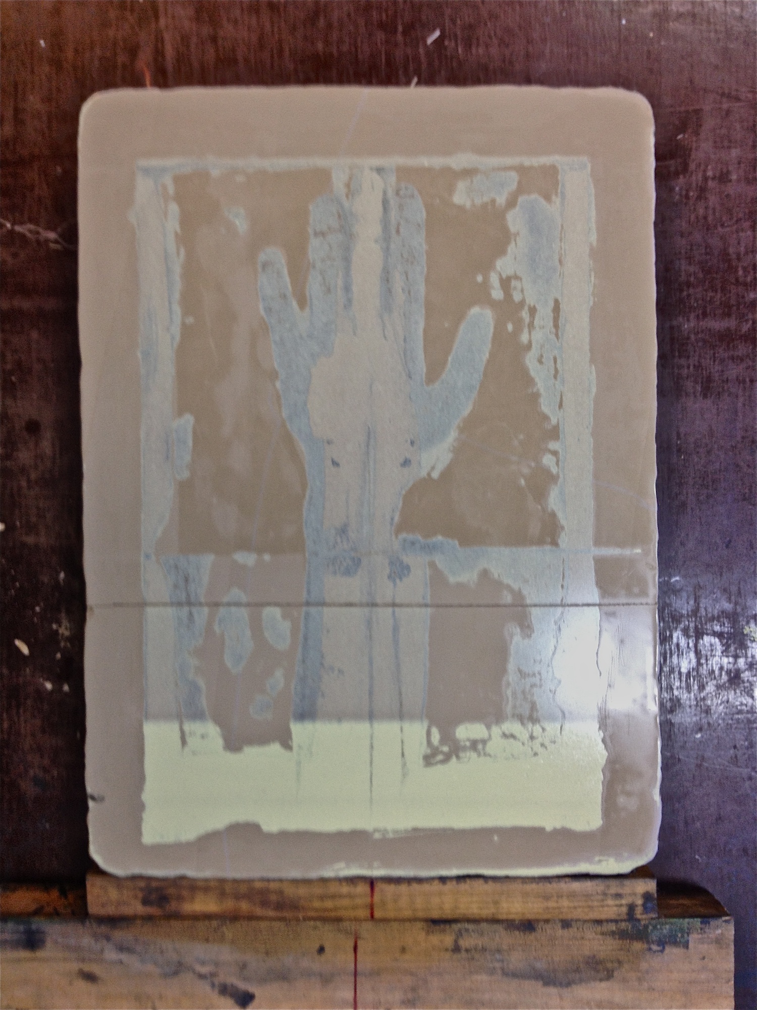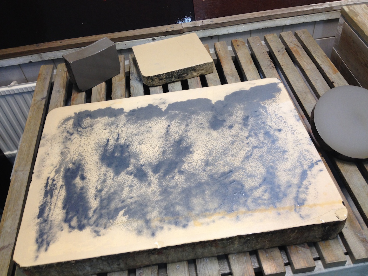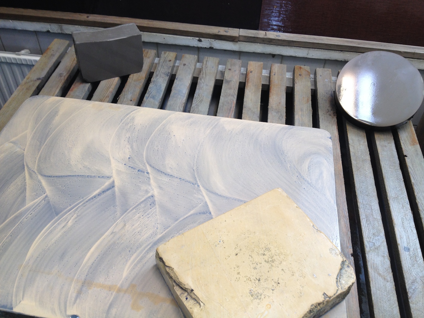 Mostly I’ve been working in the lithography workshop, where Patrick Wagner has an eye and a helping hand for everything and everyone. I’ve printed from two stones alternately; one fairly small, the other one large (and heavy)… The procedure for stone lithography goes something like this: grain the stone repeatedly with sand and water, until it has a clean, smooth surface; draw the image upon it; etch the image into the stone with acid and gum arabicum; roll up with printing ink; print. And then, clean up.