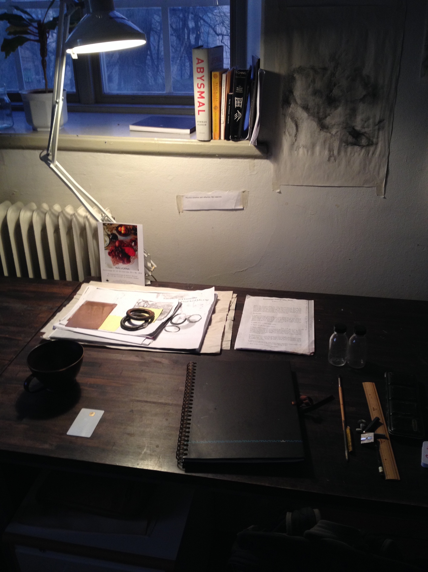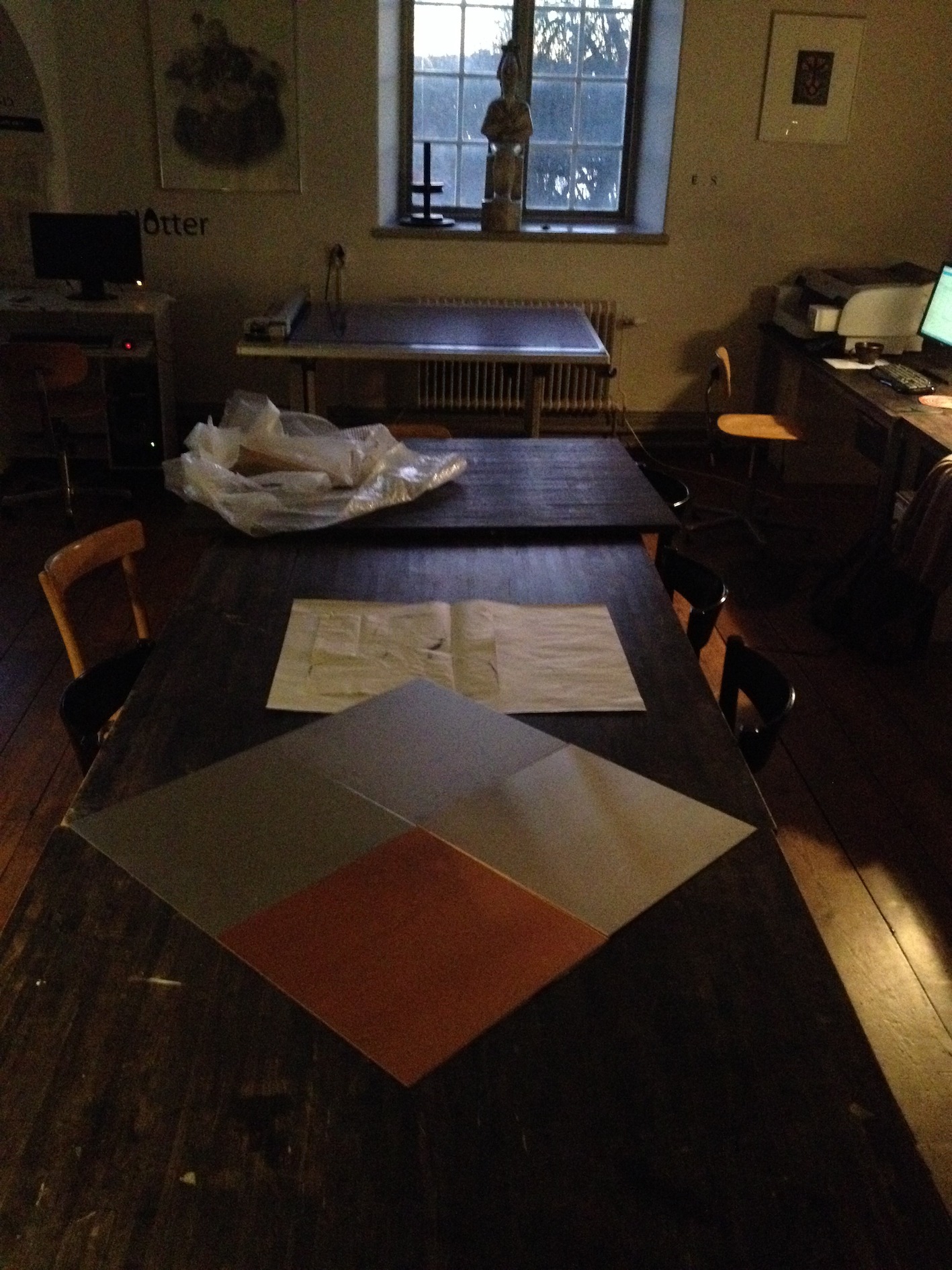 Upstairs from the litho workshop is the common area of the graphic department. Along the wall, tables are lined up in a row – one of those is at my personal disposal. I have chosen this place because usually, it’s just in the thick of things… Now, this early winter morning, the room is still dark and silent. I light the lamp and unpack my things. Dawn is breaking.