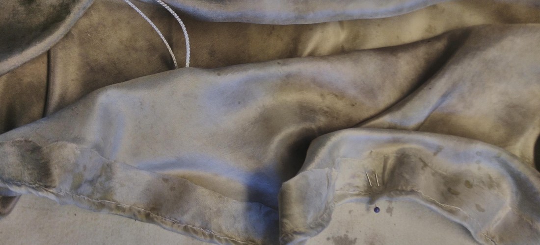 To ingrain with mud; to capture the colour of the sky… From dirt to blue – how can it be done? Testing and trying, for weeks. A dash of tea, of wine, of pomegranade juice upon the fabric… Wrapping fermented compost in pieces of thin cloth, burying them in soil; waiting, then unwrapping. Which materials leave distinct shapes and patterns?
