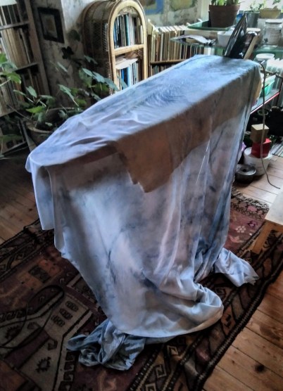 To ingrain with mud; to capture the colour of the sky… From dirt to blue – how can it be done? Testing and trying, for weeks. A dash of tea, of wine, of pomegranade juice upon the fabric… Wrapping fermented compost in pieces of thin cloth, burying them in soil; waiting, then unwrapping. Which materials leave distinct shapes and patterns?