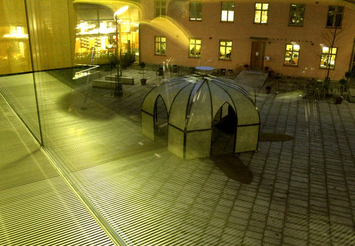 The floor plan of terrastella is pentagonal, with five doors folding outwards and downwards (also functioning as ramps for wheelchairs and baby strollers). The construction is made from glass fibre molded on welded iron frames. The cupola sports a star stretching downwards from the centre; using rebars inside the lower walls, I added pentagonal patterns corresponding to islamic ornamentation. Visitors frequently made associations to churches as well as mosques and tents; many brought coffee or food from the cafeteria and stayed inside to chat, read or work – despite the winter cold. Large rugs felted from black wool were hanging from the cupola, for visitors to wrap themselves up and stay warm.
